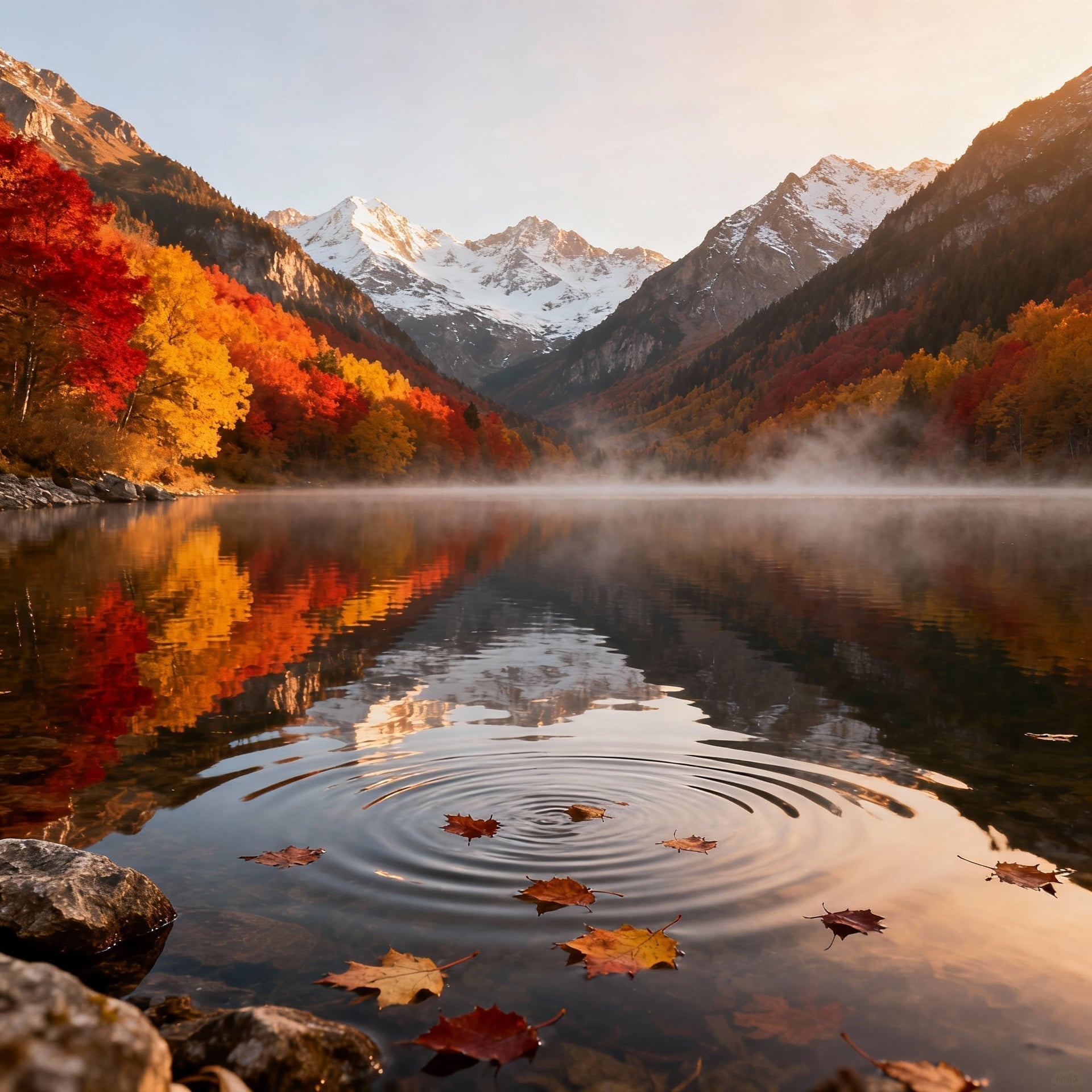 "A beautiful autumn landscape with a lake a mountain"
